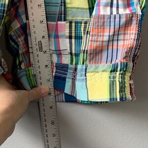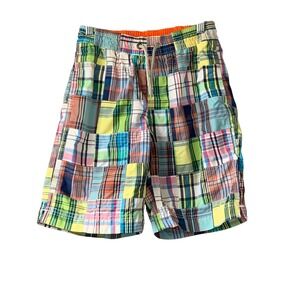 Gap Surf kids preppy multi plaid swim trunks with side and rear pockets. Elastic draw string waist. Lined with mesh. Flaw: small pull of top of tie see last pic. Tags: preppy, traditional, country club, patchwork, plaid. Size M