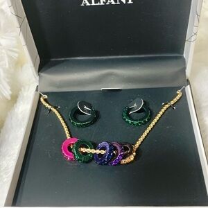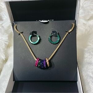 Earrings are green and necklace is gold with multi colored pave highlighted rings. Lobster clasp. Approx length of the necklace is 17” with a 2” extender. A great match for any outfit!!