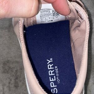 Chic light pink sneakers featuring a navy insole. Ideal for casual outings.