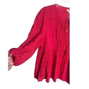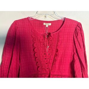Max Studio Cerise pink peasant blouse top in size Large. This charming top features a textured fabric, a flattering empire waist with delicate lace trim, and a tie neckline with intricate circular lace detailing on the yoke. Three-quarter length puff sleeves with elasticized cuffs add a touch of bohemian flair. Perfect for casual outings, brunches, or vacation wear.