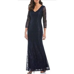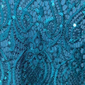 Marina Teal Blue Green Allover Lace and Sparkle Sequin Long Sleeve Maxi Dress. Long Length. Sleeves are sheer. V-neck. Back v. Hidden zipper. Fully lined with stretchy material. Hourglass shape.