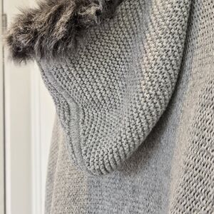 Cozy gray cable knit poncho. Perfect for layering. Stylish and warm with a faux fur trimmed hood.