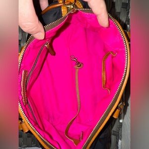 Dooney & Bourke Black Satchel with Tan Trim and Bright Pink Interior
