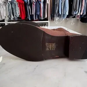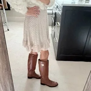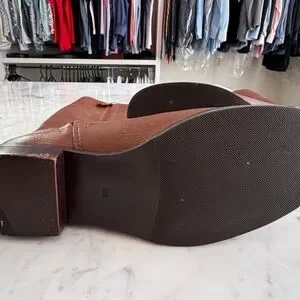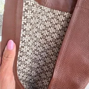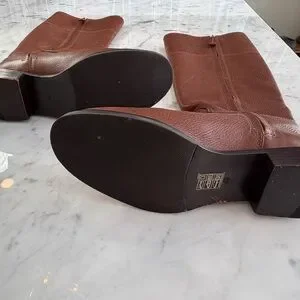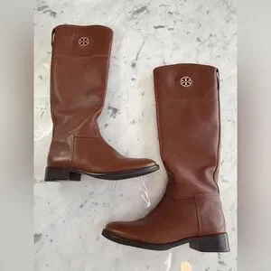 Preowned brown leather Tory Burch boots. Size 8. Perfect for winter wear. Features iconic Tory Burch logo in gold. Condition is good with some wear as shown in photos.