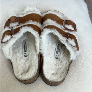Experience ultimate comfort with Birkenstock's brown slippers, featuring plush shearling lining and adjustable straps for a perfect fit. The durable sole ensures stability, making them ideal for both indoor and outdoor use.Slightly used.