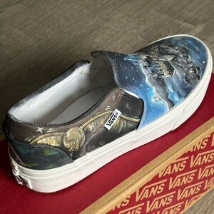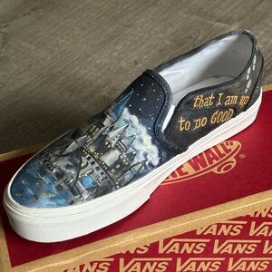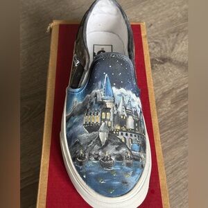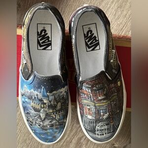 Vans slip-on sneakers with Harry Potter theme. Features platform 9 3/4 and Deathly Hallows symbols. Hand painted and only worn once for photos at universal studios. A happy potter one of a kind! Smoke free, pet friendly home