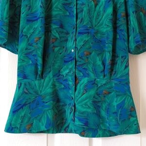 Leslie Fay 80's Vintage Banana Leaf Silky Short Sleeve Button Down Peplum Blouse