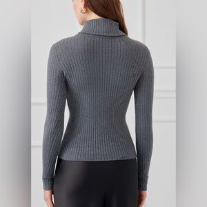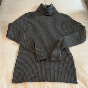 J.McLaughlin Gray Arlette Turtleneck Sweater is ribbed and fitted. Size Large. Enamel buttons on sleeves. Extra button on the inside label. Worn once by mom.