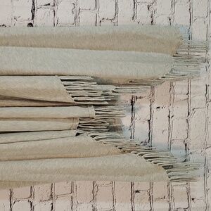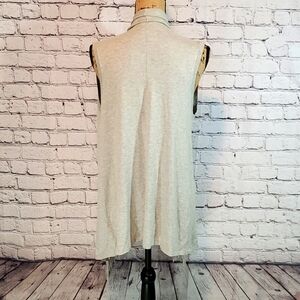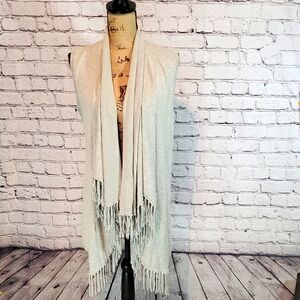Light gray fringed sleeveless cardigan by Central Park West. Excellent pre-loved condition - no pilling, stains or other blemishes — only very subtle signs of wear from washing. Size medium. About 37 inches long at longest point. The back is about 27 inches long.
