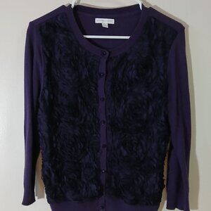 New York & Co. dark plum button-up cardigan with ruffled rosette pattern on front side - size medium. Buttons are purple jeweled buttons. In excellent condition, smoke-free home.