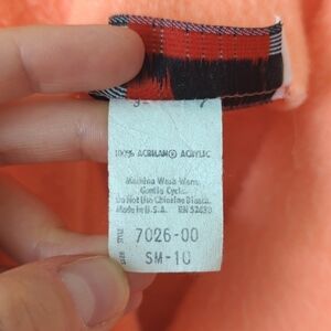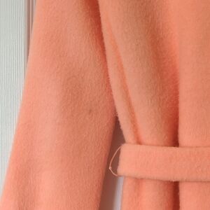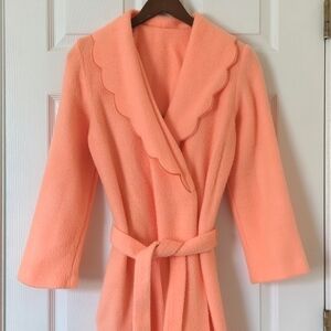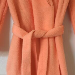 VTG and straight out of the 80s - This beautiful robe was made in the USA to feature a scalloped collar, long sleeves, an open pocket on the right hip, a tie at the waist for fastening and an internal tie for additional hold. It has a maxi length and is oversized for a relaxed, roomy fit. It is a stunning neon peach color. Loose and flowy, it is composed of a fuzzy material making it warm and comfortable - perfect for Fall and Winter! This piece is very soft, super cute, retro, different and unique! Could also be worn as a funky coat!