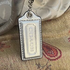 This is a beautiful coach with silver and clean interior. Very good condition. Has a longer strap option . measurements in inches approximately 13 wide , 9 tall, strap 5 inch , 5.5 deep /// AI-Chic Coach satchel with metallic silver accents. Off white body with signature pattern. Ideal for everyday elegance.