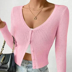 Pink Casual Women's Slim Solid Color Rib Knit Cardigan