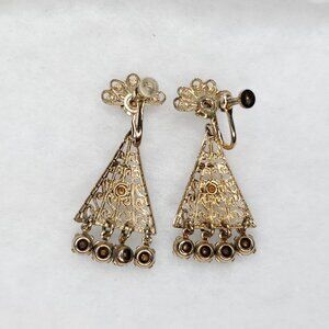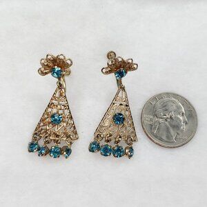 Vintage Chandelier Earrings Gold Tone Filigree Blue Rhinestone Dangle Screw Back