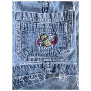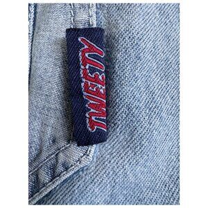 Vintage licensed Looney Tunes denim shortalls featuring an embroidered Tweety Bird character on the bib pocket. A classic 1990s to early 2000s (Y2K-era) piece with that perfectly nostalgic cartoon-core vibe. Perfect for fans of vintage cartoon apparel, Y2K fashion, festival outfits, or collector Looney Tunes pieces.