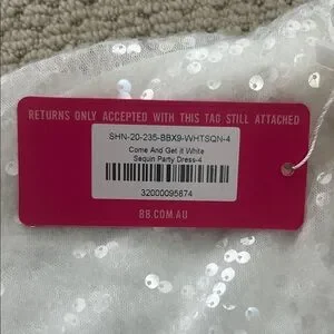 Dazzle in this white sequin mini dress. Perfect for glamorous events. Sleek and stylish design. This dress is brand new in perfect condition. It is NWT as shown in the pictures. It has a zipper on the side and a tie back. I could sell with the tote bag on the last photo.
