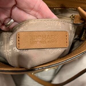 Elegant Michael Kors crossbody in rich cognac. Features gold-tone logo plate. Ideal for daily use. Zipper on top, pocket on outside and multiple compartments inside. Pretty interior fabric! 10” W X 9.5” L