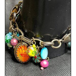 ESTATE SALE FIND. Colorful and vibrant, this boho bracelet features floral charms, multicolor beads, and an antiqued bronze chain, adding a playful touch to any outfit.