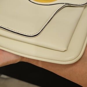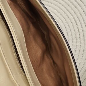 This elegant cream bag features a luxurious design with a striking gold accent. Perfect for adding a touch of sophistication to any outfit.