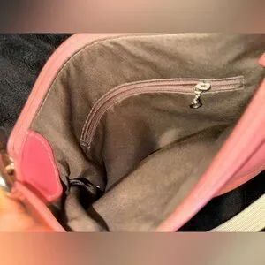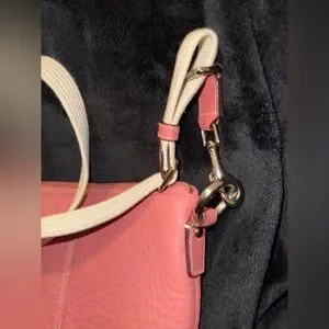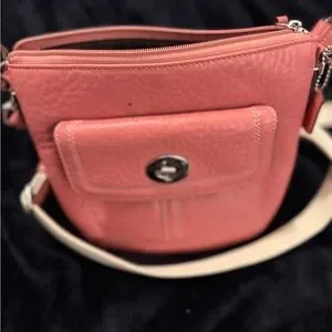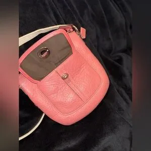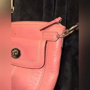 Stylish coral crossbody bag by Coach. Features gold hardware and an adjustable strap. Ideal for daily wear. Coach Pebbled Leather Mauve Crossbody bag.