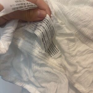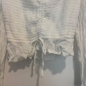 Hollister White Smocked Crop Top with Puff Long Sleeves. Stretchy gauze fabric and construction. Smocked bodice with puff sleeves. Elastic at cuffs and shoulders. Can be worn off the shoulder or on top of the shoulder. Center tie vertically adjusts top. In excellent condition. Only worn a handful of times.