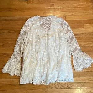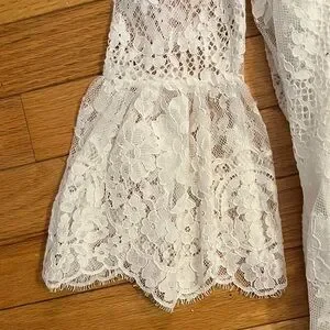 Elegant white lace dress with bell sleeves. Perfect for a chic look.
