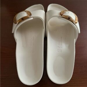 Chic white sandals featuring a bold gold buckle. Ideal for everyday comfort and style.