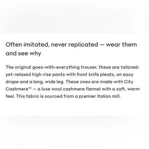 The original goes-with-everything trouser, these are tailored-yet-relaxed high-rise pants with front knife pleats, an easy drape and a long, wide leg. These ones are made with City Cashmere™ — a luxe wool cashmere flannel with a soft, warm feel. This fabric is sourced from a premier Italian mill.