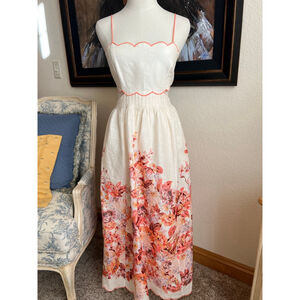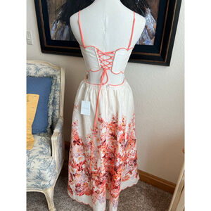 This is a new-with-tags Zimmermann Devi Scallop Midi Dress in Cream Floral, size US 10 (AU 3, UK 14, FR 42, IT 46). The dress features a cream-colored linen-blend fabric with a vibrant coral floral print on the skirt. It has a scalloped neckline and waistline, accented with coral piping, and thin coral spaghetti straps. The back of the bodice has a lace-up corset-style closure with coral lacing. The skirt is a midi length with pleating at the waist.