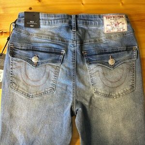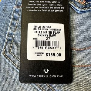 NWT True Religion Halle Flap skinny raw jeans! These jeans are high rise super skinny. These do have some stretch has the button flap pockets on back. Inseam between 28 and 29 on both sizes. Extra nice 159 retail 🥰