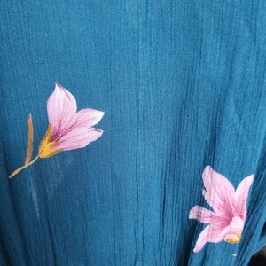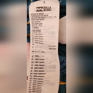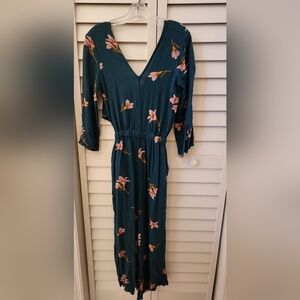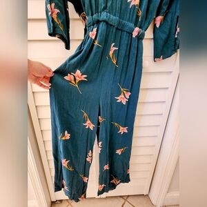 Billabong floral jumpsuit with fuchsia flowers on a teal background, Size Small. The jumpsuit wraps around the back to make a little key hole in the lower back or can be tightened to close it up; makes a v in the upper back when tied. Light flowy fabric, super breathable, with an elastic band at the lower back. The color is teal (blue/green) as seen in the stock photos, but looks a little darker in some of the photos of the actual jumpsuit due to lighting. I'm 5ft 120lbs and it fits me more like pants than capris. Still has plenty of life left in her travels!