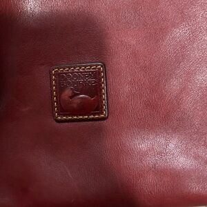 Elegant red leather hobo bag. Features gold-tone hardware. Classic and stylish design.
