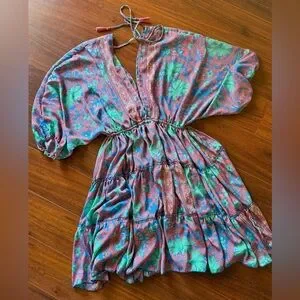 Multicolor print, adjustable tassel tie waist, and lightweight fabric.