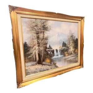 R Thomas OIL PAINTING On Canvas Waterfall Mountain River Pine Trees Forest Large 25" x 29" Framed Gold Wood - Excellent Condition!