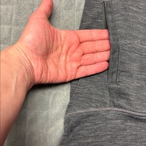 This Athleta hooded sweatshirt is a size XS with the measurements in the photos. The sweatshirt has pockets and thumbholes. It is a forest green color, which doesn't show up the best with my mediocre photography skills. The little metal end is missing off one of the hood drawstrings so I just knotted it.