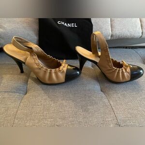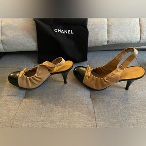 These chic and glamorous Chanel pumps are a great addition to any wardrobe! Shoes feature black patent leather on the toes and elasticized tan slingback uppers. CHANEL "CC" logo is embossed on the leather bowtie at the front of the shoes. Leather-lined uppers make for a comfortable fit and a touch of class