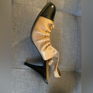This is a pair of Chanel CC logo bow cap-toe slingback heels in beige and black leather