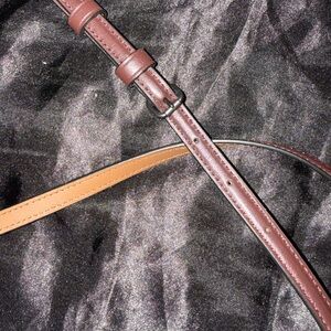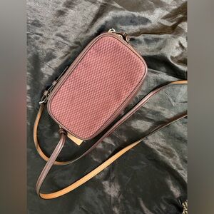 ❀ Coach Crossbody Pouch in Legacy Jacuard. This is a compact dual zipper bag. Color is like a deep reddish/maroon. Featuring inside multifunction pockets, with two credit card slots, and adjustable straps for shoulder or crossbody wear.