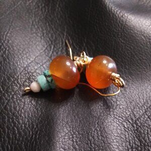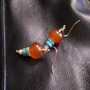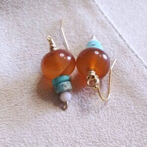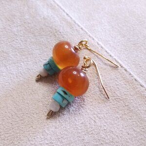 These are short and stocky - but substantial due to the large, thick, chunky orange Agate beads. Also in this design - turquoise colored Howlite Heishis and tiny white ceramic beads. Gold plated stainless steel earwires.