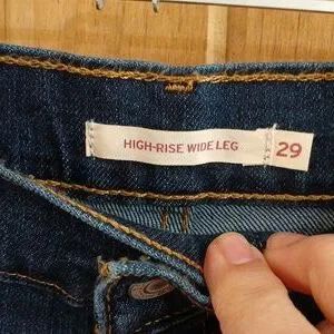 Women's Levi's Red Tab crop denim jeans. Size 29. High rise/ Wide Leg. Dark rinse stretch denim. Measures (flat): 15" across waist, 26" inseam, 11" across leg opening, and 37 1/2" overall length.