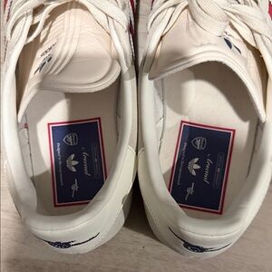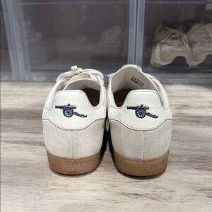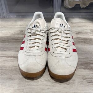 Classic Adidas in collaboration with Arsenal. Sneakers with cream suede and striking red stripes. Perfect for everyday style. Very good pre owned condition.