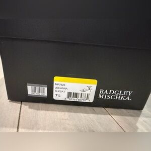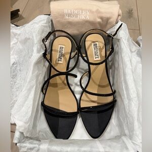 Brand new in box with dust bag: never worn (except tried on once on carpet) sir 7.5 black satin Badgely Mishka Julianna strappy heels with crystal detail on straps. Chic black heels with elegant straps. Perfect for evening wear.