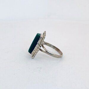 Beautiful vintage estate ring crafted in solid 925 sterling silver, featuring a striking rectangular green onyx stone set in a classic bezel with decorative beaded detailing around the frame. The stone displays a rich, deep green hue with a smooth polished surface that catches the light beautifully.