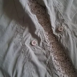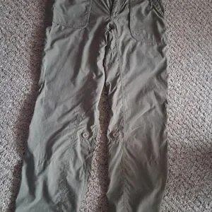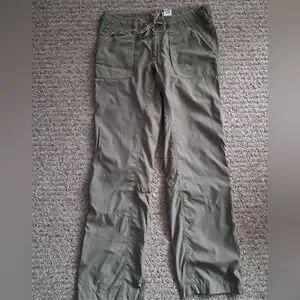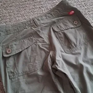 these pants are basically brand new. I've worn them once and tucked them away. they are a beautiful army green color. plenty of pockets. and they also have two buttons so you can wear them pulled up on your legs and wear them with heels if you want. these are perfect for everyday. There is a little ripple effect spot on the right leg. they actually came like that. And because of that, these pants are FINAL PRICE ITEM. No offers accepted. Other than that, they are in excellent condition! please see the last two photos before purchasing!!