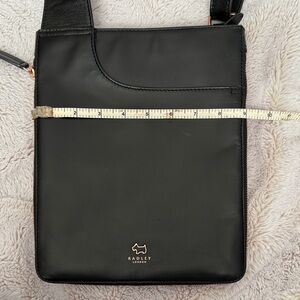 Elegant black messenger bag by Radley London. Perfect for daily essentials. Features sleek design and quality craftsmanship. Crossbody with long adjustable strap. Hardware is rose gold. Multiple compartments inside and out. Two very small imperceptible, imperfections on outside (see last photo)