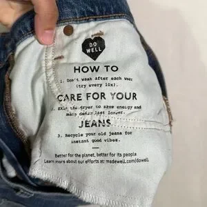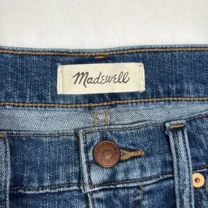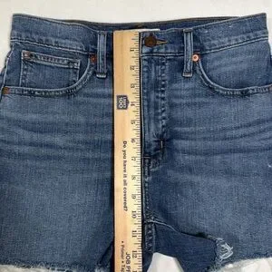 Classic blue denim shorts with a button closure. Features a stylish frayed hem.