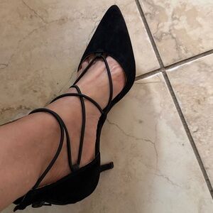 Chic black heels with lace-up design. Perfect for stylish outings.back zip closure. 2.5" heel.