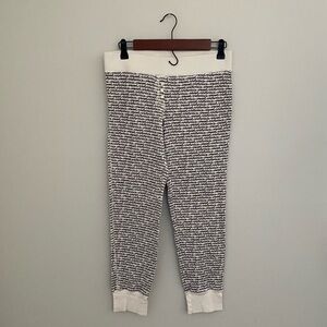 These cozy pajamas feature a stylish black and white cursive logo design. Perfect for a comfortable night's sleep. Small mark that is pictured in the cuff of the pant and some minor overall fading from being washed but still in good condition!