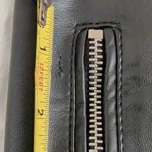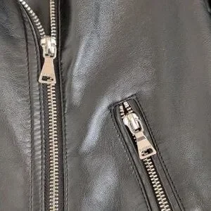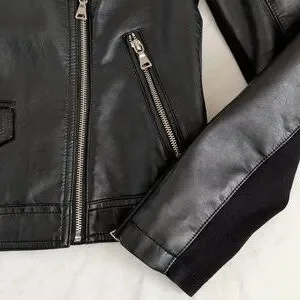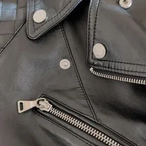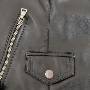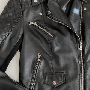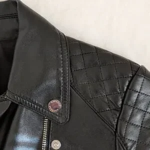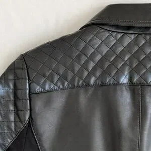 Chic black leather jacket with quilted shoulders. Features multiple zippered pockets and a sleek design. Ideal for versatile styling.
