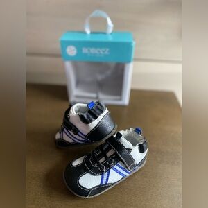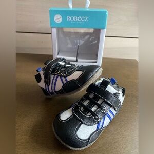 Chic Robeez baby shoes for beginning walkers. Black and white design. Ideal for first steps and little ones on the move! Rubber non-slip outsoles help to make this the perfect transition shoe.